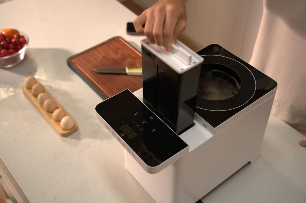A. 900gの活性炭フィルターとデュアル換気システムで、処理前後のニオイをしっかり抑える設計です。ただし魚介類などは多少ニオイが残ることがあります。