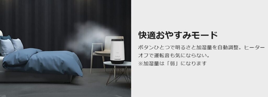・夜間の乾燥対策:4Lモデルの「おやすみモード」なら、音を抑えつつ最大20時間の加湿が可能です。8Lモデルも「おやすみボタン」ひとつで静かな運転に切り替わります